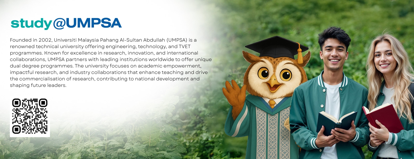 Founded in 2002, Universiti Malaysia Pahang Al-Sultan Abdullah (UMPSA) is a renowned technical university offering engineering, technology, and TVET programmes. Known for excellence in research, innovation, and international collaborations, UMPSA partners with leading institutions worldwide to offer unique dual degree programmes. The university focuses on academic empowerment, impactful research, and industry collaborations that enhance teaching and drive the commercialisation of research, contributing to national development and shaping future leaders.