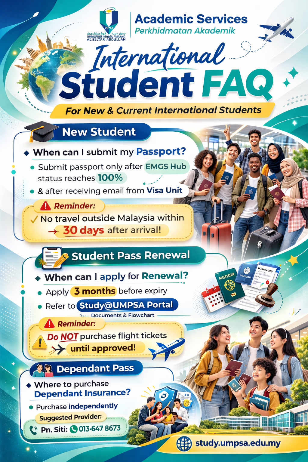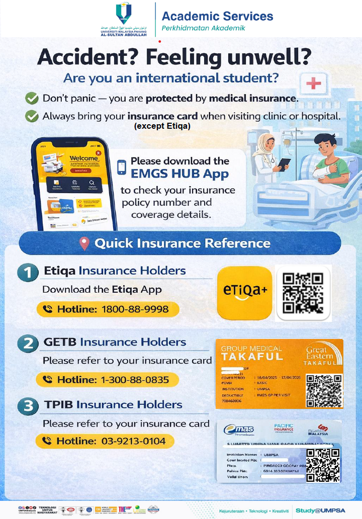 This site was made to give information to international students at University Malaysia Pahang Al-Sultan Abdullah. According to the rules and regulations of the Malaysian Immigration Department, all international students are required to have a valid Student Pass to study in Malaysia. The government agencies responsible are the Malaysian Immigration Department and the overseas Malaysian diplomatic missions (i.e. Malaysian High Commission) and Education Malaysia Global Services (EMGS) is the private body appointed by the Ministry of Higher Education to process the international student visa.